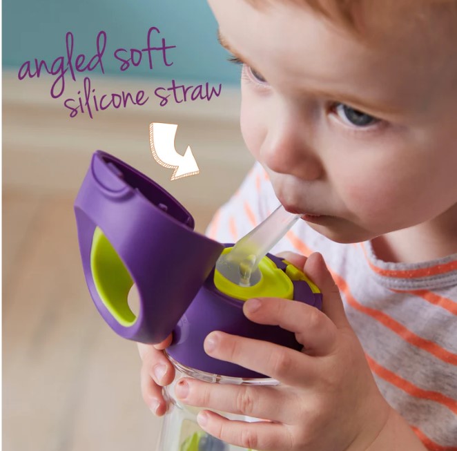 - Silicone straw top and angled straw – allows kids to drink even when tilted.
