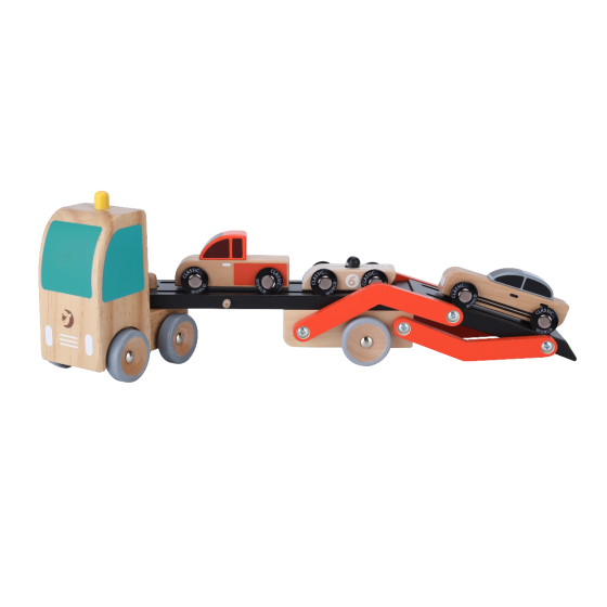 This double-decker Car Transporter has a movable top deck which can revolve down into a ramp that can load three cars onto the truck! Let's see who can load the limo and race car without a scratch!