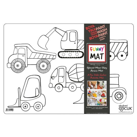 Funny Mats are produced in two different sizes with various designs. Funny Mat is a tabletop and surface protection cover that can be used in many activities. It can be used for dining, and craft projects such as painting, shaping clay and play dough. Also, it can be used as a study mat. Funny Mat is an “activity material”. The designs on Funny Mat can be coloured with water-based felt-tip pens. The colours will wash off when the mat is placed under running water so the mat can be reused again. Other materials can be used for permanent colours.