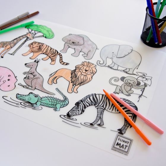 Funny Mat is a versatile, reusable table mat that protects surfaces during dining, crafting, and study activities. With water-based markers, kids can colour their fun designs, and then rinse under running water to start fresh for endless creative play.