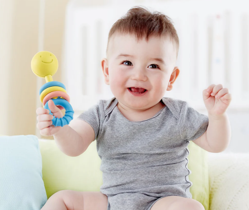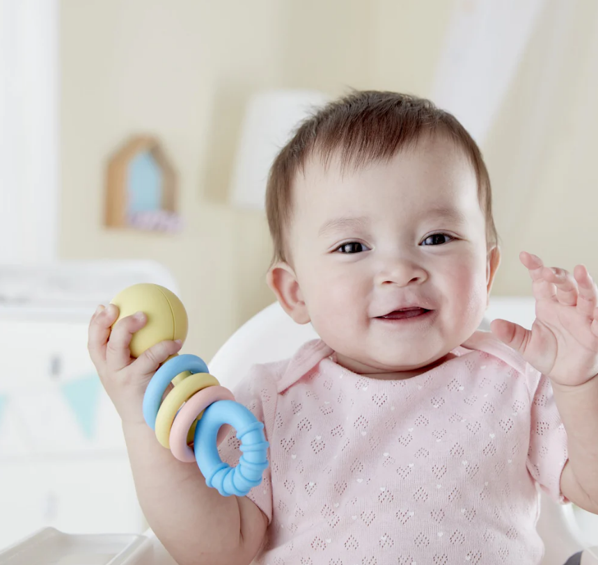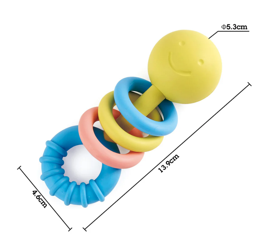 Made from a safe, rice-based material, the happy face comes with three movable rattling rings to stimulate sensory awareness and one teether ring to chew.