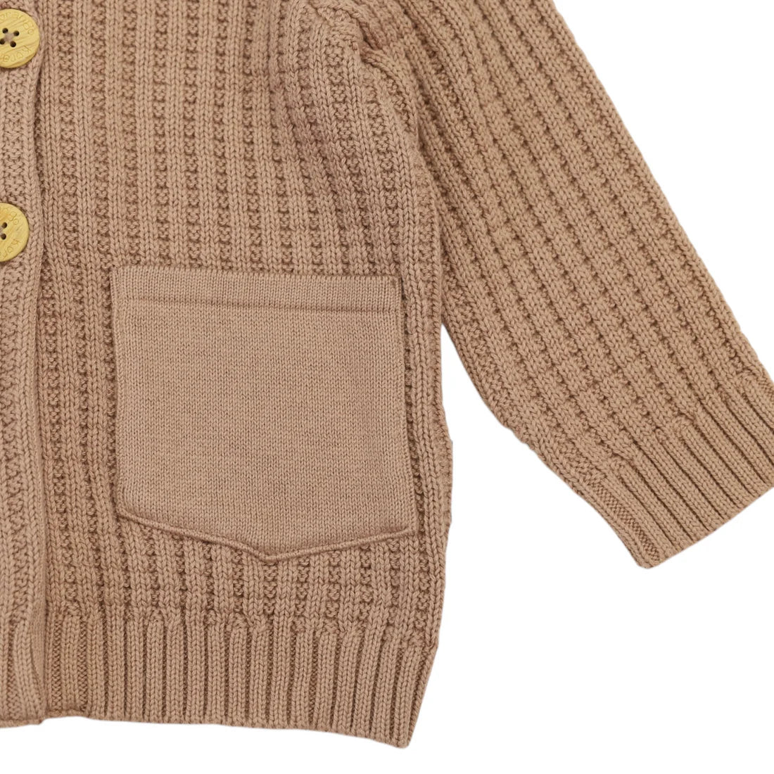 Keep your little one cozy and stylish with the Knit Chestnut Jacket! This adorable Brown textured knit jacket features playful contrast beige pockets, a soft lining, and buttons down the centre. Plus, there's a cute pom-pom on the hood for extra charm. Perfect for chilly days, it's as comfy as it is cute!