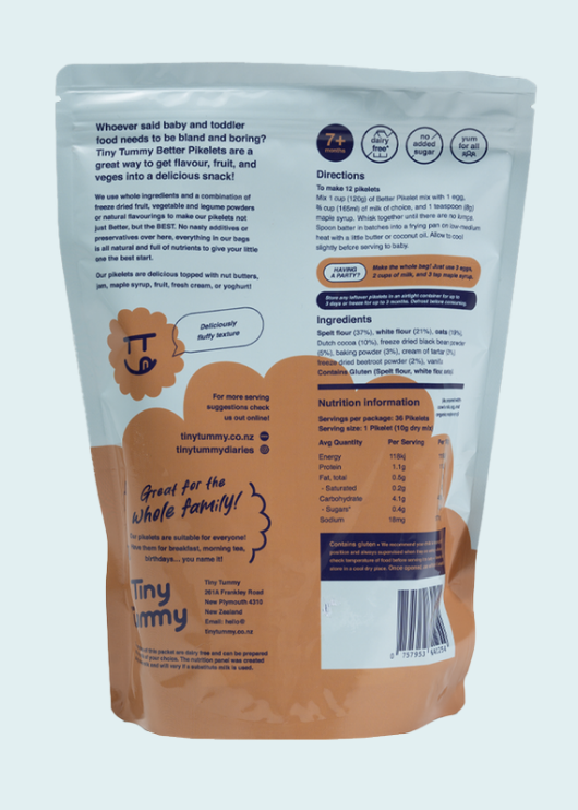 Pikelets make an easy breakfast or snack. You can have them on their own, with butter and jam, nut butter, maple syrup, fruit, and yoghurt… the options are truly endless. You can have them at home or easily take them on the go for a relatively mess free snack! Lunchboxes? Love them! Morning tea? Why not! Birthday party? You’d better believe it! But we have another secret for you… our pikelets are not only made with better, healthier base ingredients – they also contain fruits and vegetables in every serve! Yep, you read that right. And the best part? Your kids won’t even know the difference!